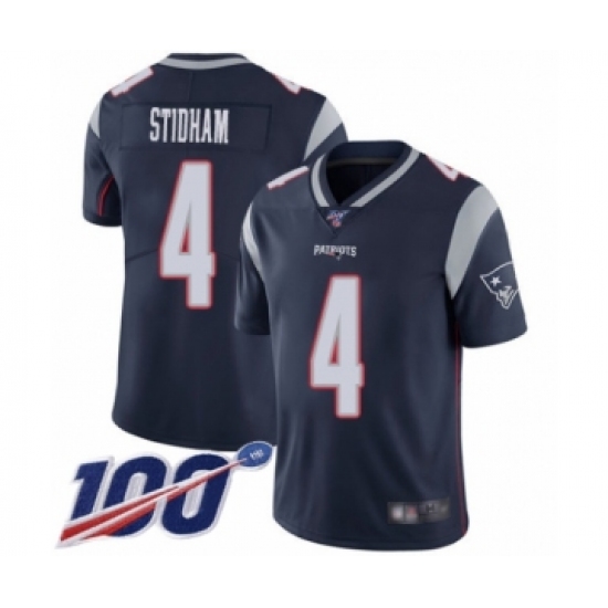 Men's New England Patriots #4 Jarrett Stidham Navy Blue Team Color Vapor Untouchable Limited Player 100th Season Football Jersey