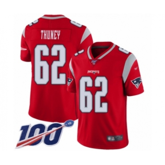 >Men's New England Patriots #62 Joe Thuney Limited Red Inverted Legend 100th Season Football Jersey
