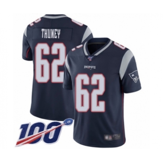 >Men's New England Patriots #62 Joe Thuney Navy Blue Team Color Vapor Untouchable Limited Player 100th Season Football Jersey