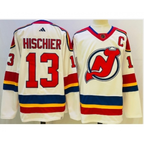 >Men's New Jersey Devils #13 Nico Hischier White 2022 Reverse Retro Authentic Jersey