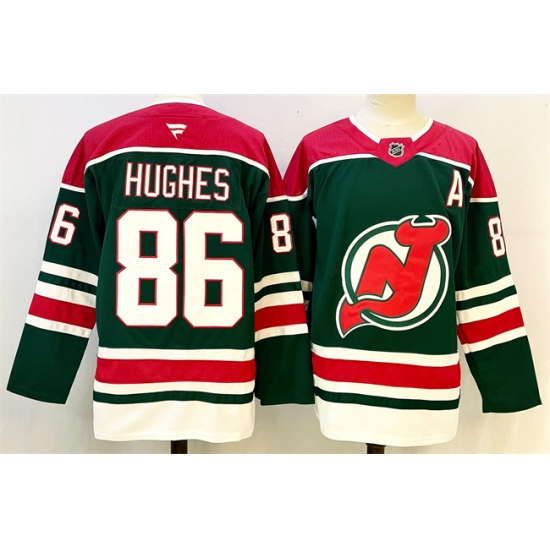 >Men's New Jersey Devils #86 Jack Hughes Green Red 2024-25 With A Stitched Hockey Jersey