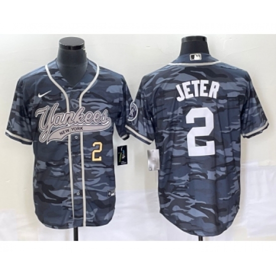 >Men's New York Yankees #2 Derek Jeter Number Grey Camo Cool Base Stitched Baseball Jersey