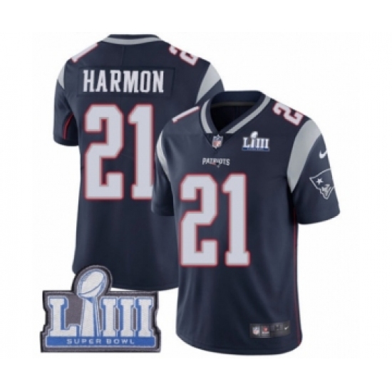 >Men's Nike New England Patriots #21 Duron Harmon Navy Blue Team Color Vapor Untouchable Limited Player Super Bowl LIII Bound NFL Jersey