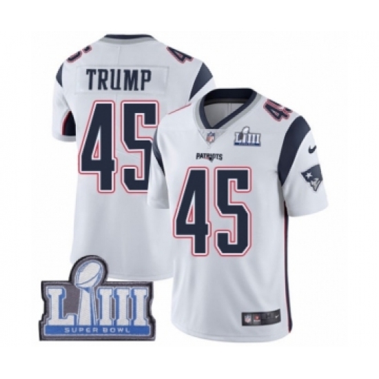 Men's Nike New England Patriots #45 Donald Trump White Vapor Untouchable Limited Player Super Bowl LIII Bound NFL Jersey