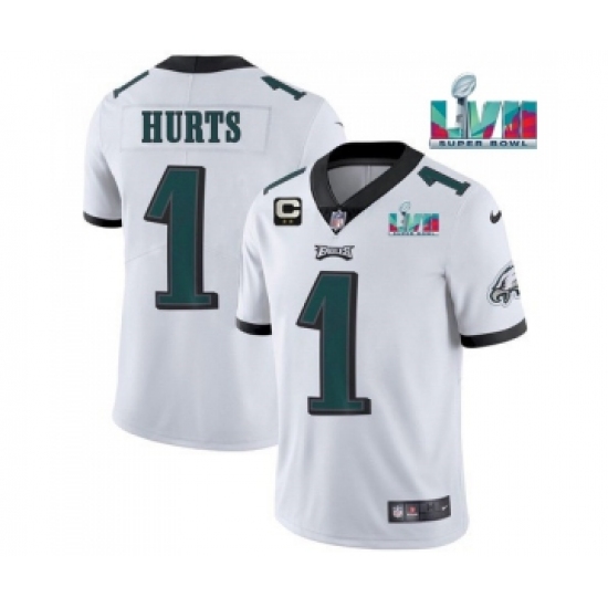 >Men's Philadelphia Eagles #1 Jalen Hurts White Super Bowl LVII Patch And 2-star C Patch Vapor Untouchable Limited Stitched Jersey