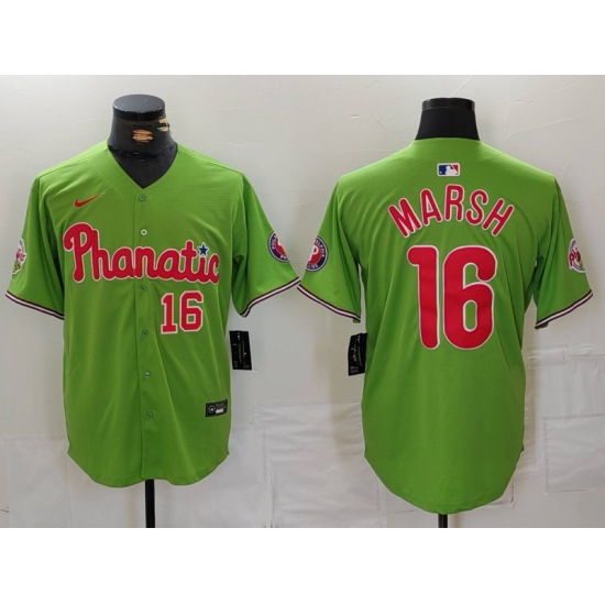>Men's Philadelphia Phillies #16 Brandon Marsh Number Green With Stitched Cool Base Nike Jersey