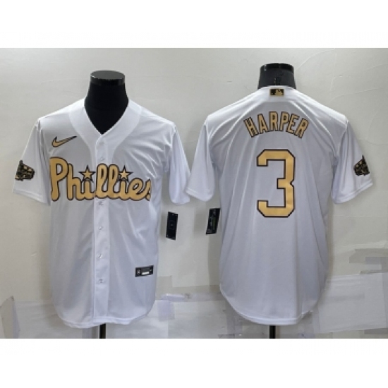 >Men's Philadelphia Phillies #3 Bryce Harper White 2022 All Star Stitched Cool Base Nike Jersey