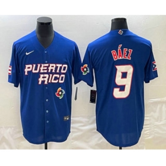 >Men's Puerto Rico Baseball #9 Javier Baez 2023 Blue World Baseball Classic Stitched Jersey
