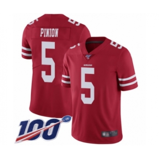 Men's San Francisco 49ers #5 Bradley Pinion Red Team Color Vapor Untouchable Limited Player 100th Season Football Jersey