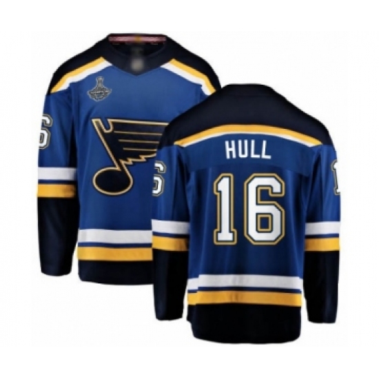 >Men's St. Louis Blues #16 Brett Hull Fanatics Branded Royal Blue Home Breakaway 2019 Stanley Cup Champions Hockey Jersey