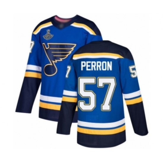 >Men's St. Louis Blues #57 David Perron Authentic Royal Blue Home 2019 Stanley Cup Champions Hockey Jersey