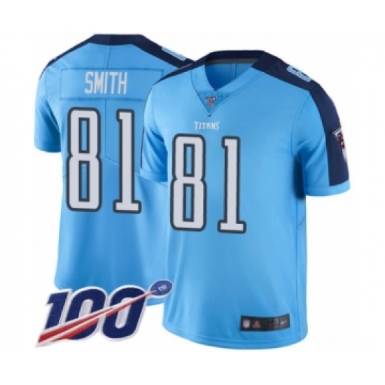 >Men's Tennessee Titans #81 Jonnu Smith Limited Light Blue Rush Vapor Untouchable 100th Season Football Jersey