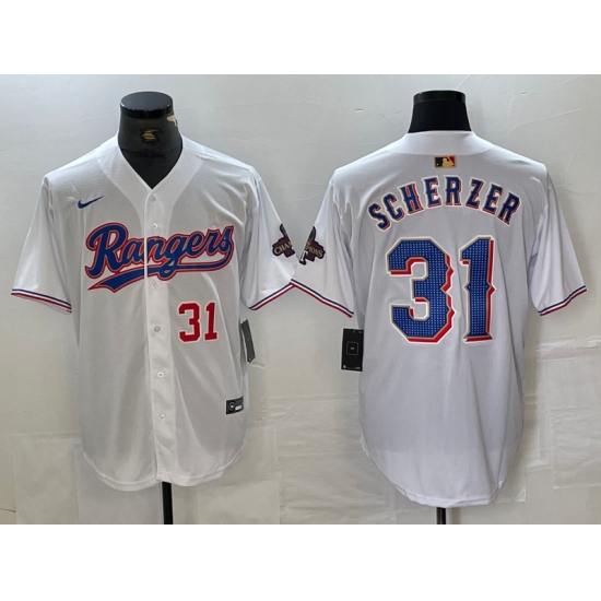 Men's Texas Rangers #31 Max Scherzer 2023 White World Series Stitched Baseball Jersey
