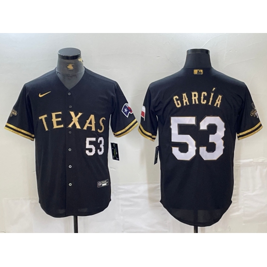 Men's Texas Rangers #53 Adolis Garcia Black Gold Cool Base Stitched Baseball Jersey