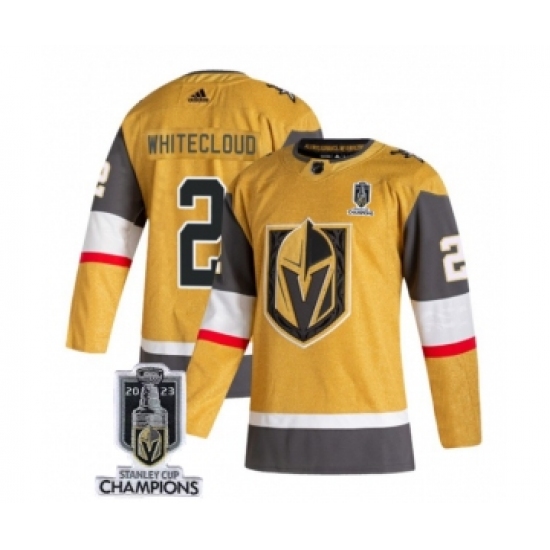 >Men's Vegas Golden Knights #2 Zach Whitecloud Gold 2023 Stanley Cup Champions Stitched Jersey