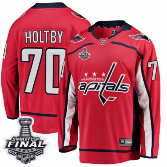 >Men's Washington Capitals #70 Braden Holtby Fanatics Branded Red Home Breakaway 2018 Stanley Cup Final NHL Jersey