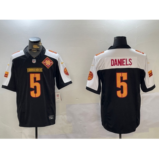 >Men's Washington Commanders #5 Jayden Daniels Black White 2024 F.U.S.E. 90th Anniversary Vapor Limited Stitched Football Jersey