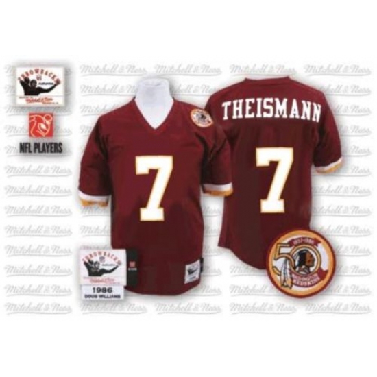 Feel like part of your favorite team by wearing this NFL® Mitchell and Ness Washington Redskins #7 Joe Theismann Red With 50TH Patch Authentic Throwback NFL Jersey, made of thick, high-quality Pro-Brite fabric for a genuine gridiron look. The players number which 100% stitched is displayed in tackle twill on the chest, back and sleeves, along with the team name on the front. The players name which 100% stitched is displayed on a sewn-down nameplate at the back. 100% Pro-Brite nylon and 100% Pro-Brite polyester for body, 100% lycratalic spandex dazzle for Side Panels/Collar/Cuffs, NFL® Equipment patch sewn on the bottom of the front collar or fabric insert, NFL® Equipment jock tag with numeric sizing is applied to the lower left bottom of the jersey, Officially licensed.