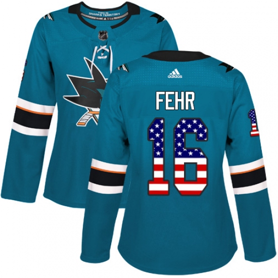 >Women's Adidas San Jose Sharks #16 Eric Fehr Authentic Teal Green USA Flag Fashion NHL Jersey