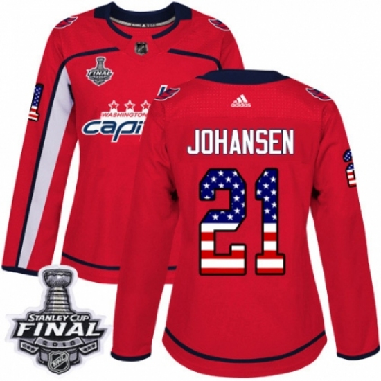 Women's Adidas Washington Capitals #21 Lucas Johansen Authentic Red USA Flag Fashion 2018 Stanley Cup Final NHL Jersey