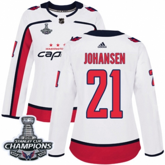 Women's Adidas Washington Capitals #21 Lucas Johansen Authentic White Away 2018 Stanley Cup Final Champions NHL Jersey