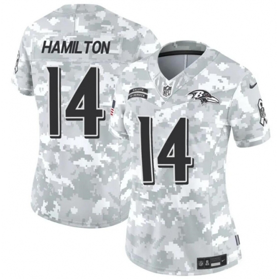 >Women's Baltimore Ravens #14 Kyle Hamilton 2024 F.U.S.E Arctic Camo Salute To Service Limited Stitched Football Jersey(Run Small)