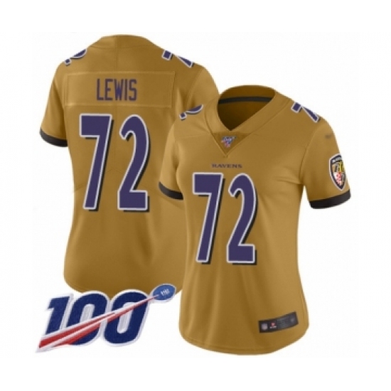 >Women's Baltimore Ravens #72 Alex Lewis Limited Gold Inverted Legend 100th Season Football Jersey