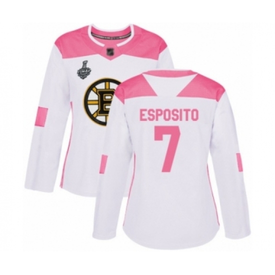 Women's Boston Bruins #7 Phil Esposito Authentic White Pink Fashion 2019 Stanley Cup Final Bound Hockey Jersey