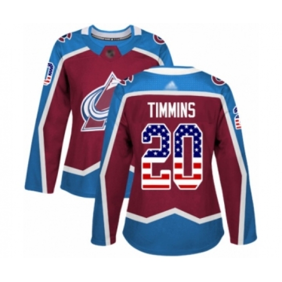 >Women's Colorado Avalanche #20 Conor Timmins Authentic Burgundy Red USA Flag Fashion Hockey Jersey