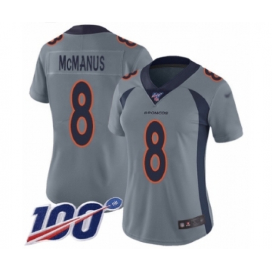 >Women's Denver Broncos #8 Brandon McManus Limited Silver Inverted Legend 100th Season Football Jersey