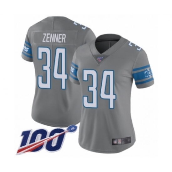 >Women's Detroit Lions #34 Zach Zenner Limited Steel Rush Vapor Untouchable 100th Season Football Jersey