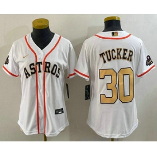 Women's Houston Astros #30 Kyle Tucker 2023 White Gold World Serise Champions Cool Base Stitched Jersey