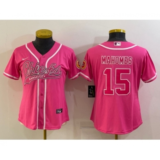 >Women's Kansas City Chiefs #15 Patrick Mahomes Pink With Patch Cool Base Stitched Baseball Jersey