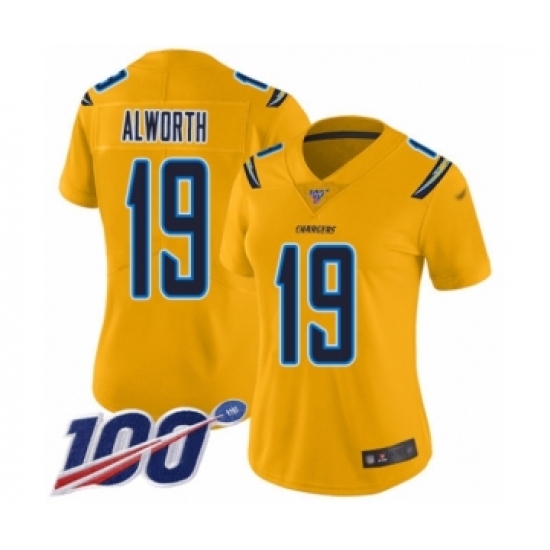 >Women's Los Angeles Chargers #19 Lance Alworth Limited Gold Inverted Legend 100th Season Football Jersey