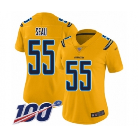 >Women's Los Angeles Chargers #55 Junior Seau Limited Gold Inverted Legend 100th Season Football Jersey