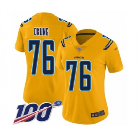 >Women's Los Angeles Chargers #76 Russell Okung Limited Gold Inverted Legend 100th Season Football Jersey