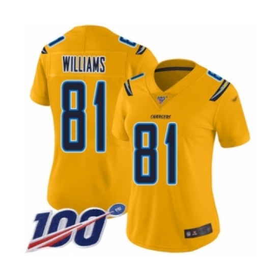 >Women's Los Angeles Chargers #81 Mike Williams Limited Gold Inverted Legend 100th Season Football Jersey