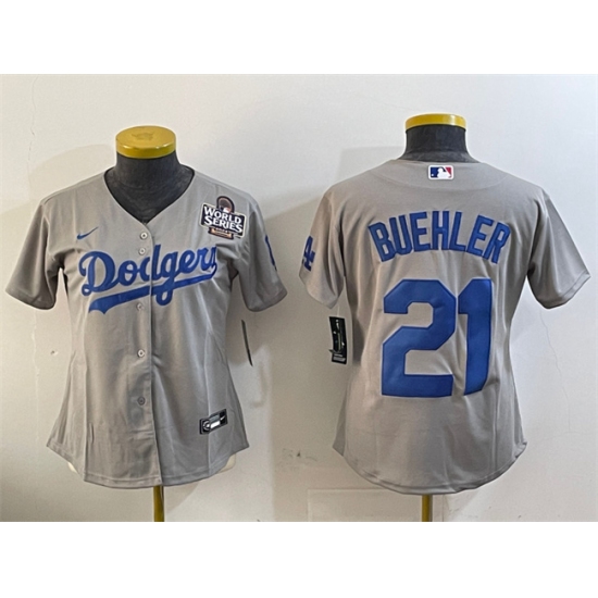 >Women's Los Angeles Dodgers #21 Walker Buehler Grey 2024 World Series Cool Base Stitched Baseball Jersey(Run Small)