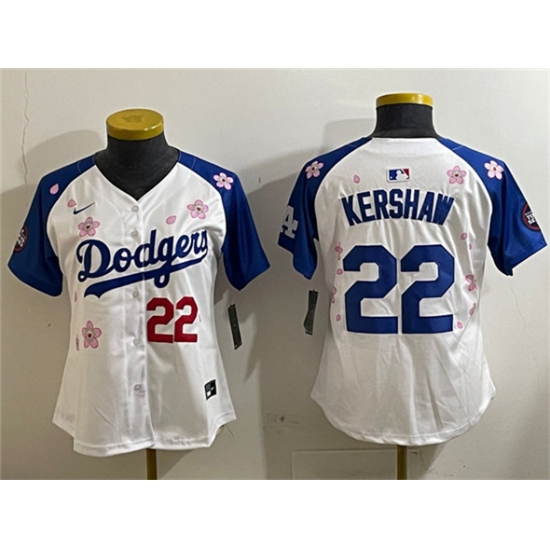 Women's Los Angeles Dodgers #22 Clayton Kershaw White Royal 2025 Tokyo Series Limited Stitched Baseball Jersey(Run Small)