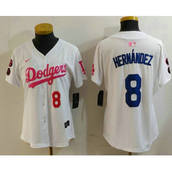 >Women's Los Angeles Dodgers #8 Kike Hernandez Number White Pink With Limited Stitched Jersey