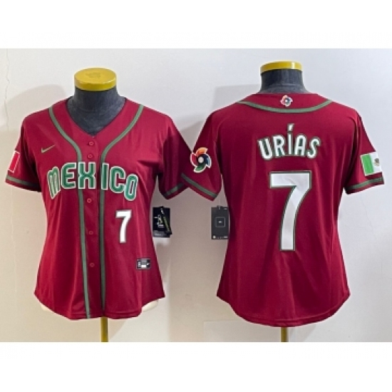 >Women's Mexico Baseball #7 Julio Urias Number 2023 Red World Baseball Classic Stitched Jersey2
