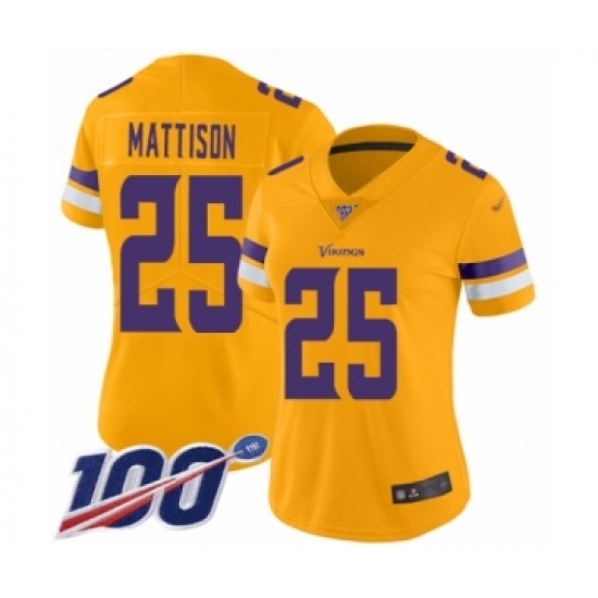>Women's Minnesota Vikings #25 Alexander Mattison Limited Gold Inverted Legend 100th Season Football Jersey