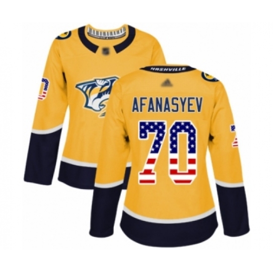 >Women's Nashville Predators #70 Egor Afanasyev Authentic Gold USA Flag Fashion Hockey Jersey