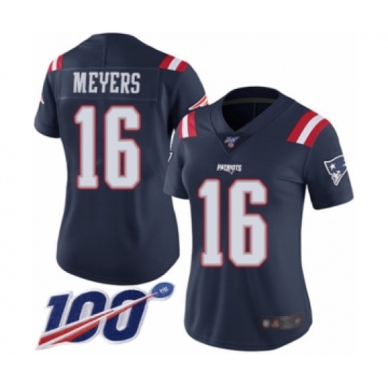>Women's New England Patriots #16 Jakobi Meyers Limited Navy Blue Rush Vapor Untouchable 100th Season Football Jersey