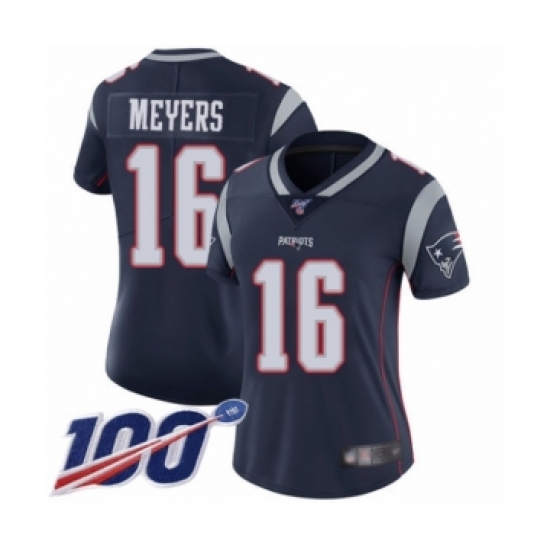 >Women's New England Patriots #16 Jakobi Meyers Navy Blue Team Color Vapor Untouchable Limited Player 100th Season Football Jersey