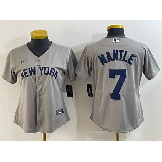 >Women's New York Yankees #7 Mickey Mantle Name 2021 Grey Field of Dreams Cool Base Stitched Jersey