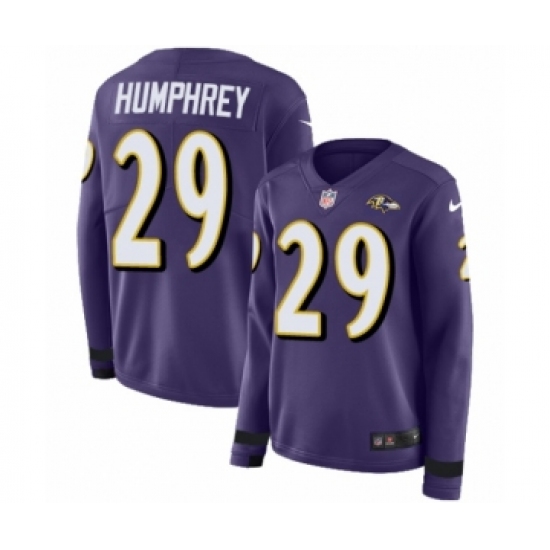 >Women's Nike Baltimore Ravens #29 Marlon Humphrey Limited Purple Therma Long Sleeve NFL Jersey