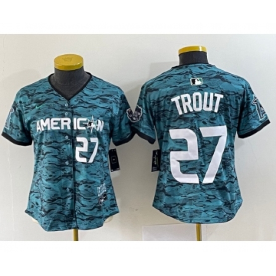 >Women's Nike Los Angeles Angels #27 Mike Trout Number Teal 2023 All Star Cool Base Stitched Jersey