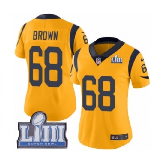 >Women's Nike Los Angeles Rams #68 Jamon Brown Limited Gold Rush Vapor Untouchable Super Bowl LIII Bound NFL Jersey