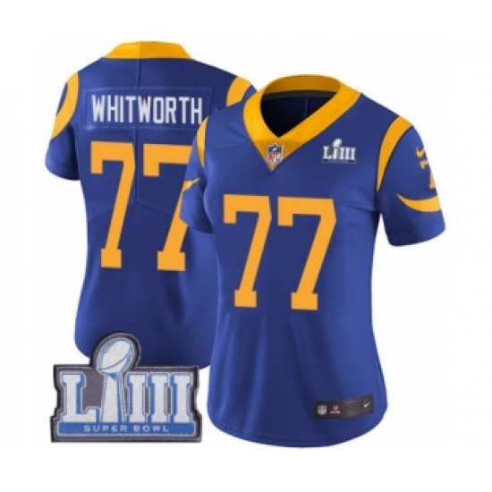 Women's Nike Los Angeles Rams #77 Andrew Whitworth Royal Blue Alternate Vapor Untouchable Limited Player Super Bowl LIII Bound NFL Jersey